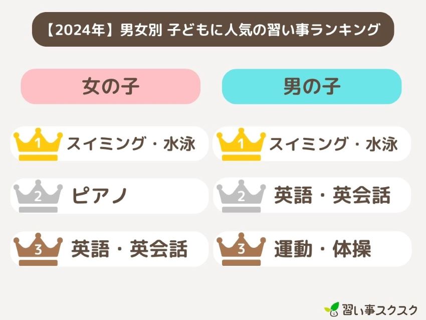 また、高学年になるにつれて「学習塾」の割合も増加します(男の子5位:9.4%)。 中学受験対策だけでなく、「勉強を少しでもしてほしい」「苦手科目をなくしたい」という切実な親心が反映されています。子供の特性に合わせて、運動系でストレスを解消させつつ、学習系で土台を固める。この「二刀流」が、現代の忙しい小学生のトレンドとなっています。